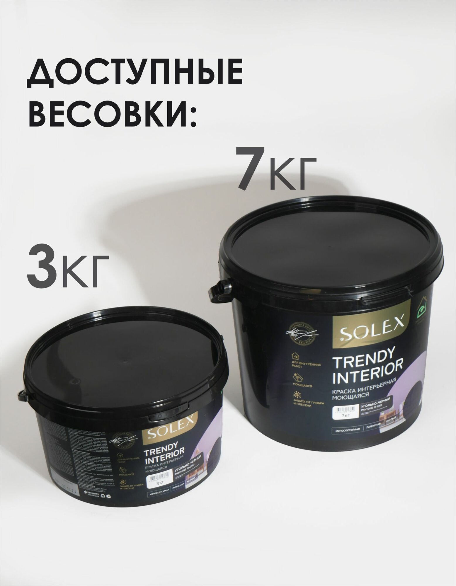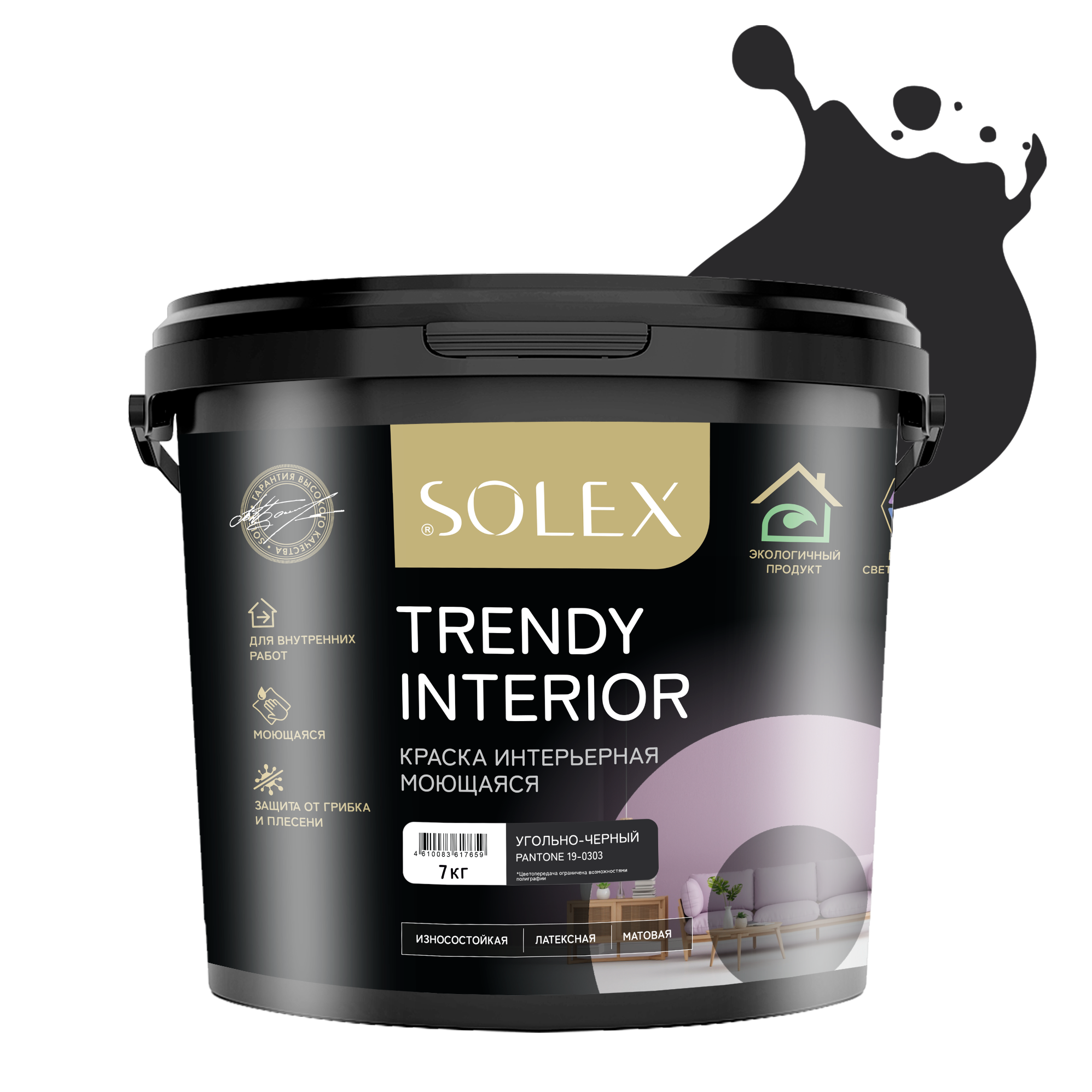 Купить Краска для стен и обоев интерьерная моющаяся, TRENDY INTERIOR, SOLEX - угольно-черный (7 кг.)