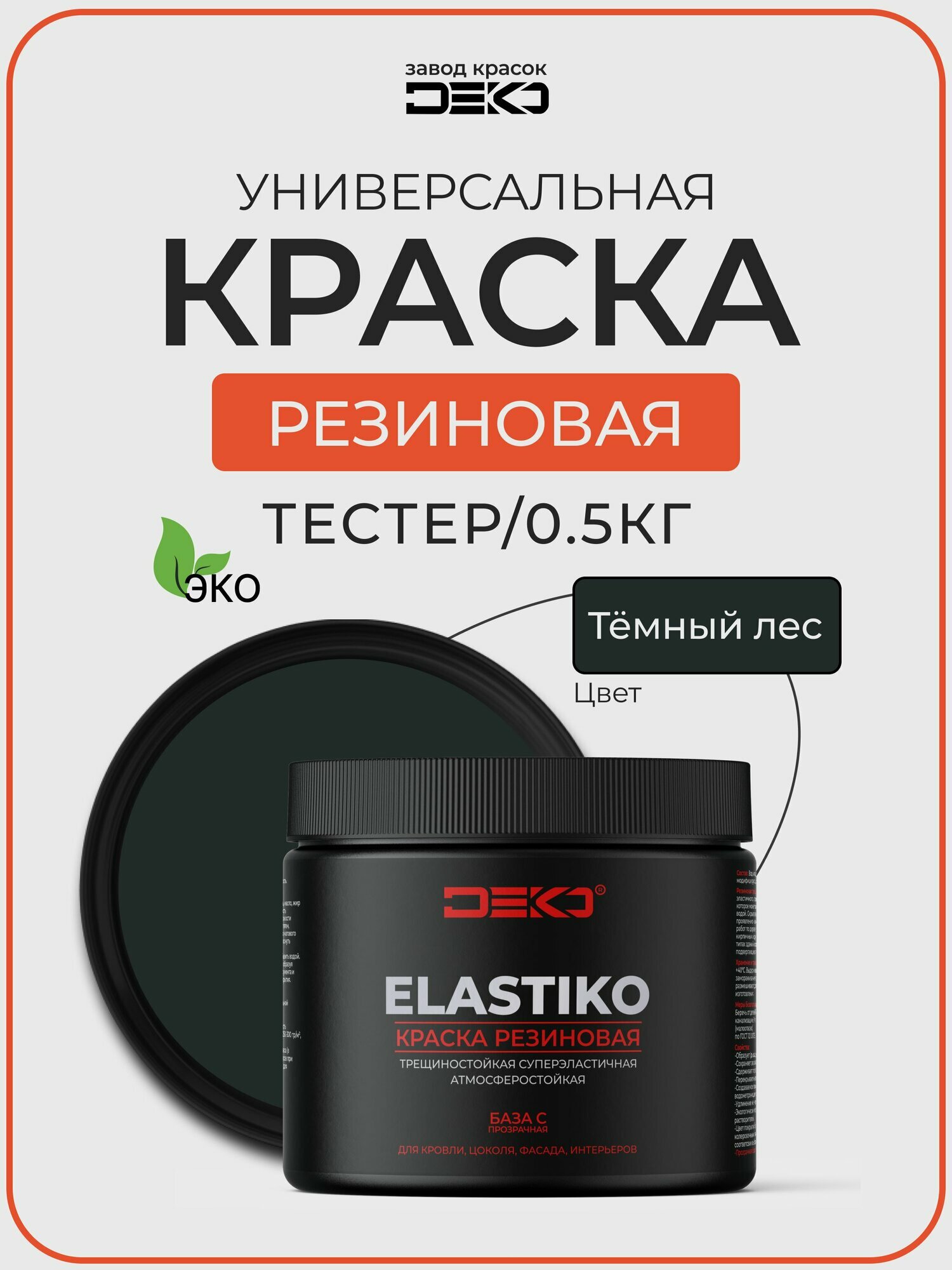 СохранитьКраска резиновая акриловая DEKO ELASTIKO, цвет тёмный ЛЕС 500гр. Для влажных помещений, фасадов, стен и потолков интересное: