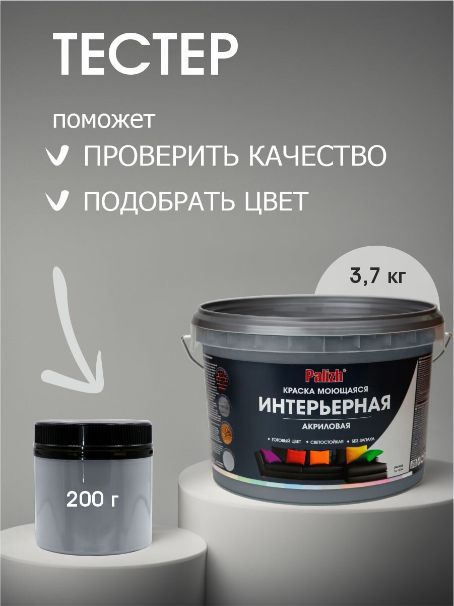 Краска для стен, обоев и потолков акриловая моющаяся интерьерная матовая цветная "Palizh" тестер 200гр, серый кварц