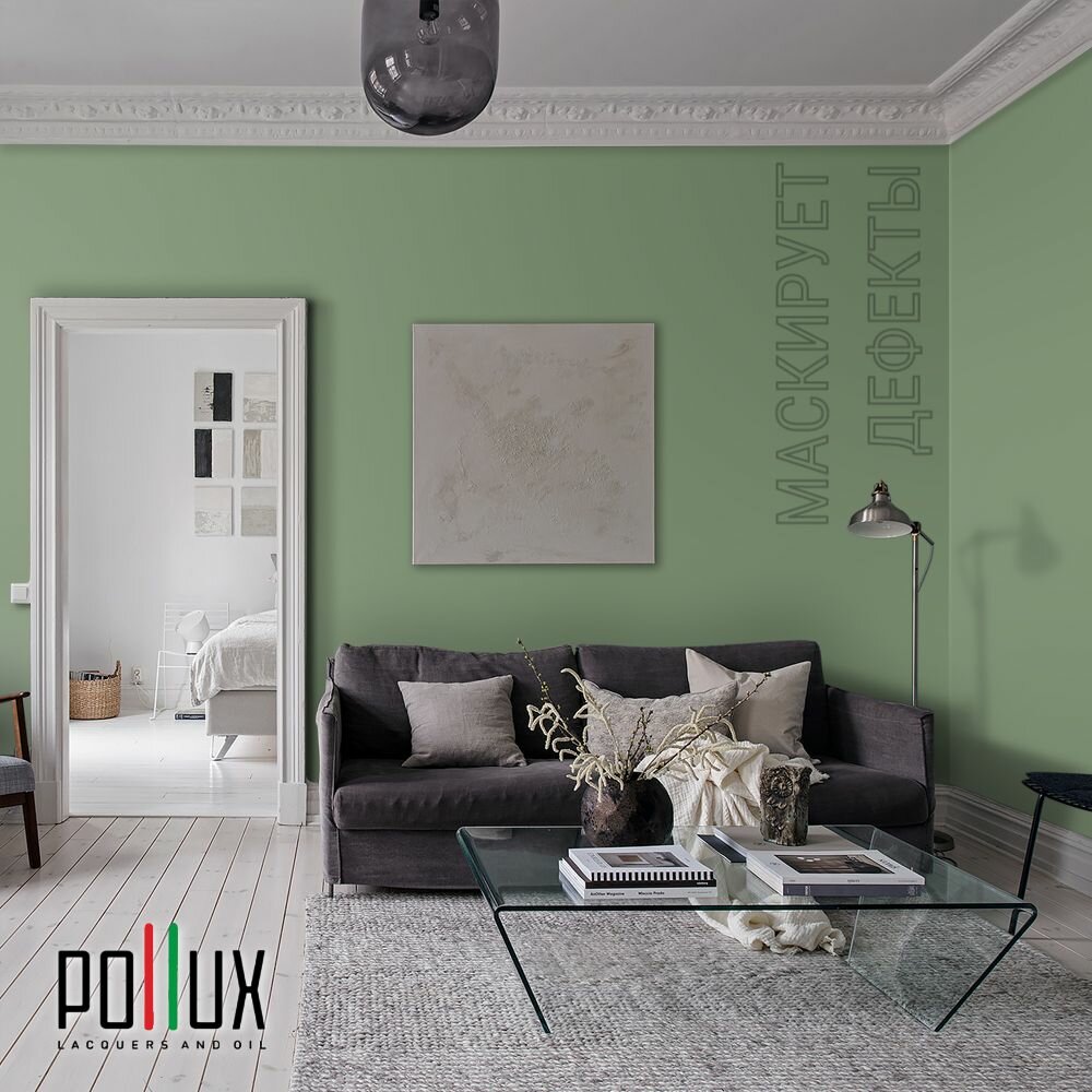Краска моющаяся интерьерная для стен и потолков, Pollux INTERIOR без запаха, быстросохнущая, акриловая, матовое покрытие, цвет NCS S 6030-G30Y, 1л.