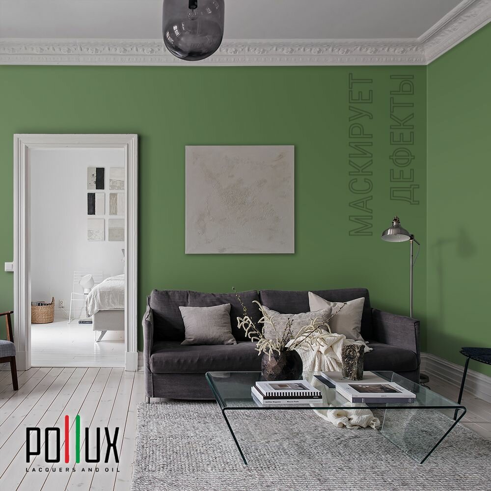 Краска моющаяся интерьерная для стен и потолков, Pollux INTERIOR без запаха, быстросохнущая, акриловая, матовое покрытие, цвет NCS S 6030-G30Y, 1л.