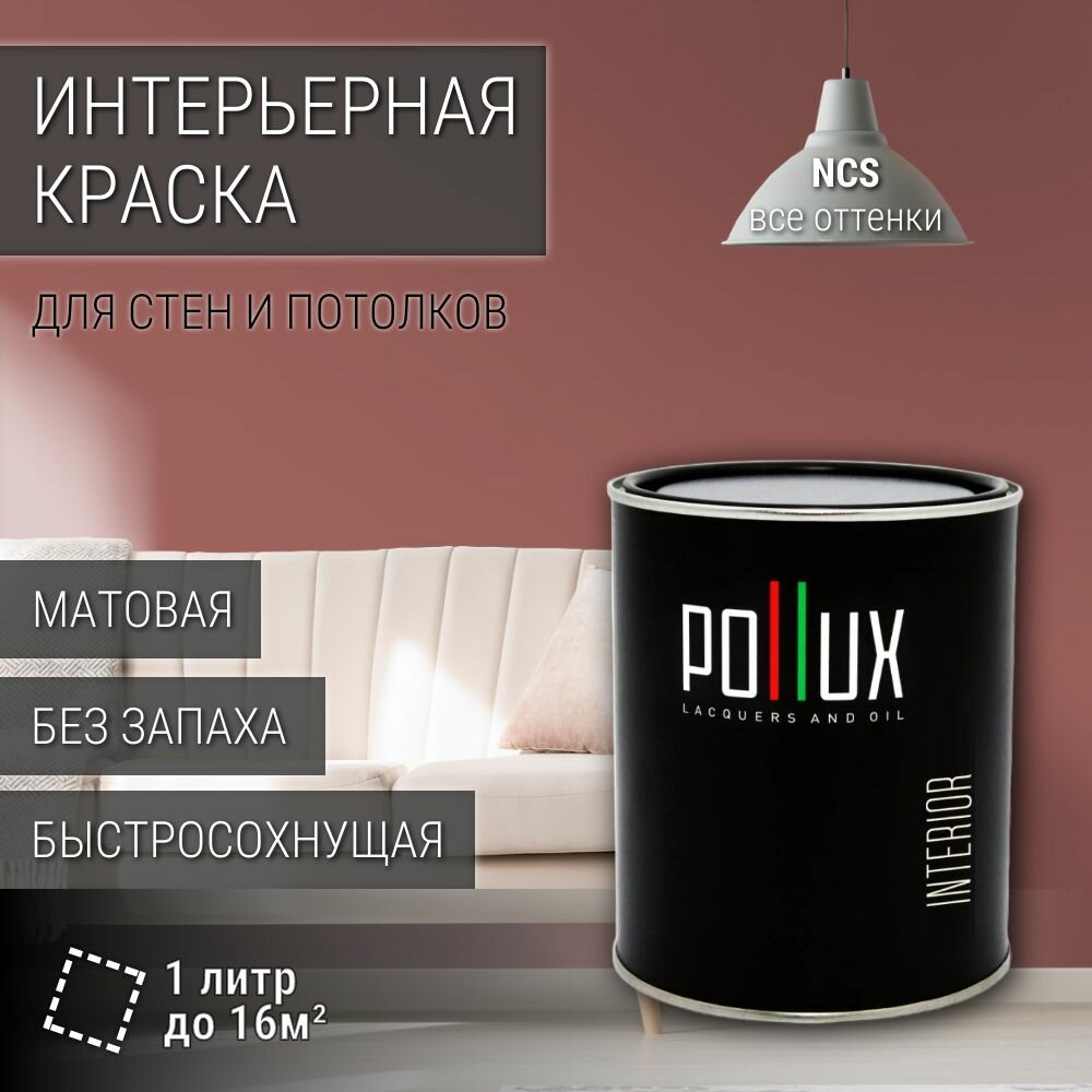 Краска моющаяся интерьерная для стен и потолков, Pollux INTERIOR без запаха, быстросохнущая, акриловая, матовое покрытие, цвет NCS S 5020-Y90R, 1л.