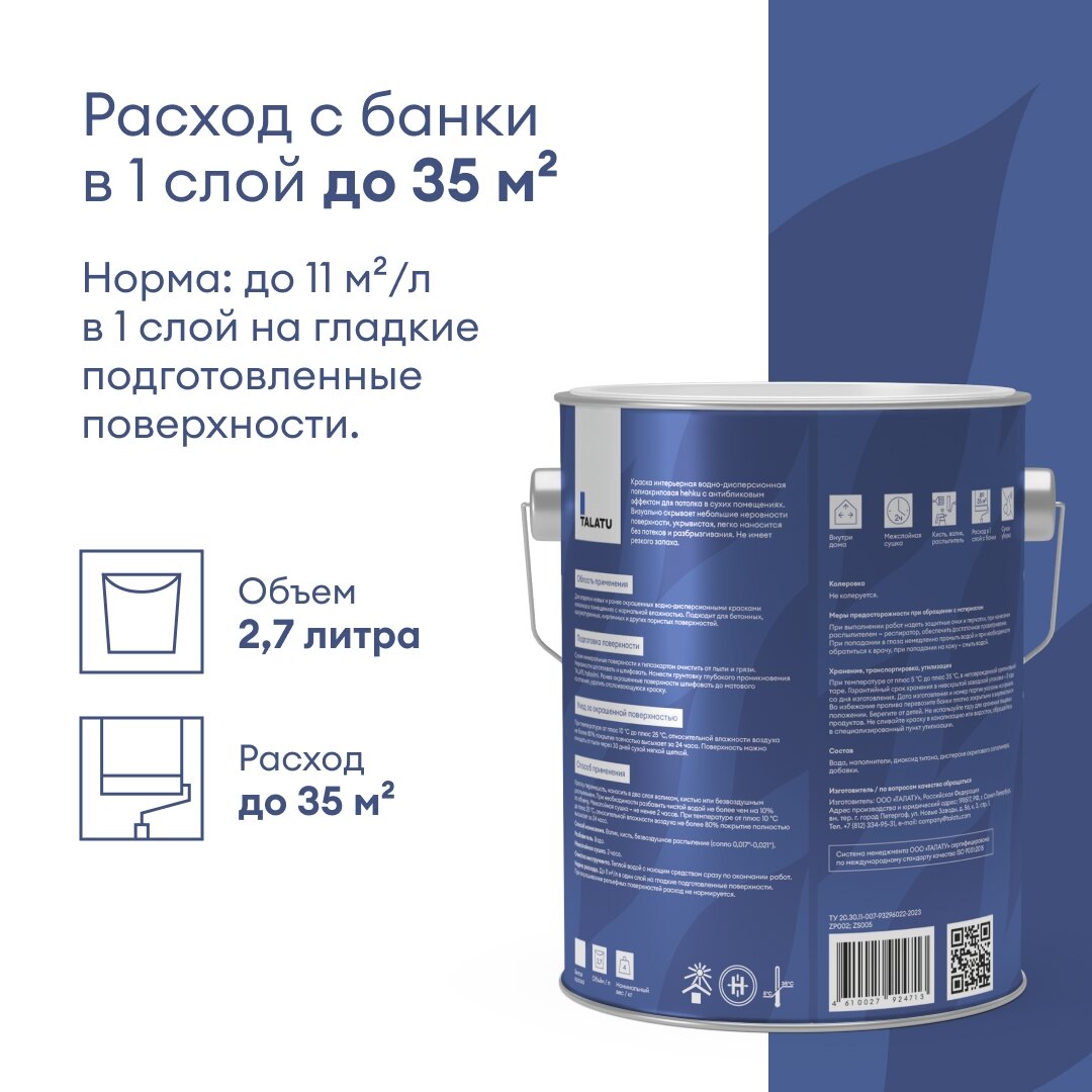 Краска для стен и потолков влагостойкая матовая TALATU RYTMI 7 база A 2,7 л