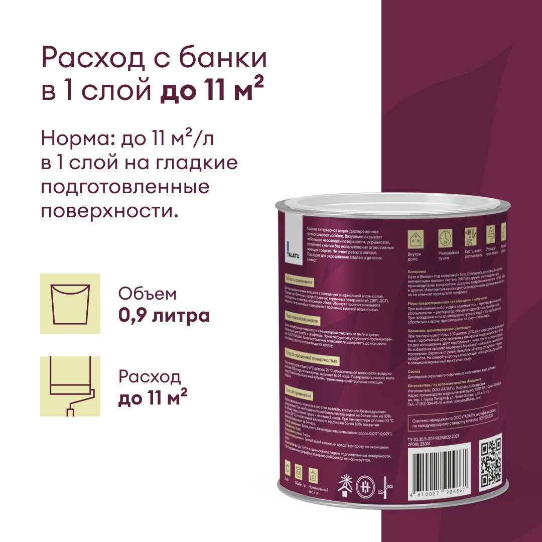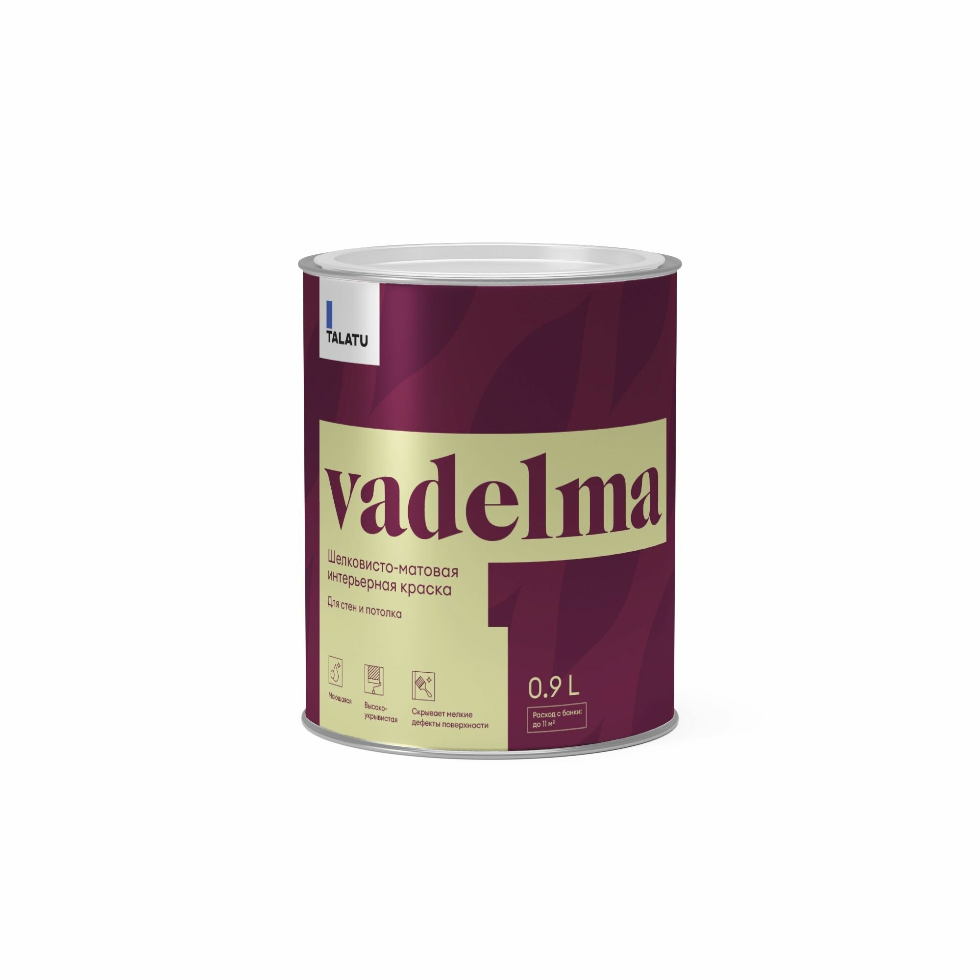 Краска для стен и потолков шелковисто-матовая TALATU VADELMA база A 0,9 л