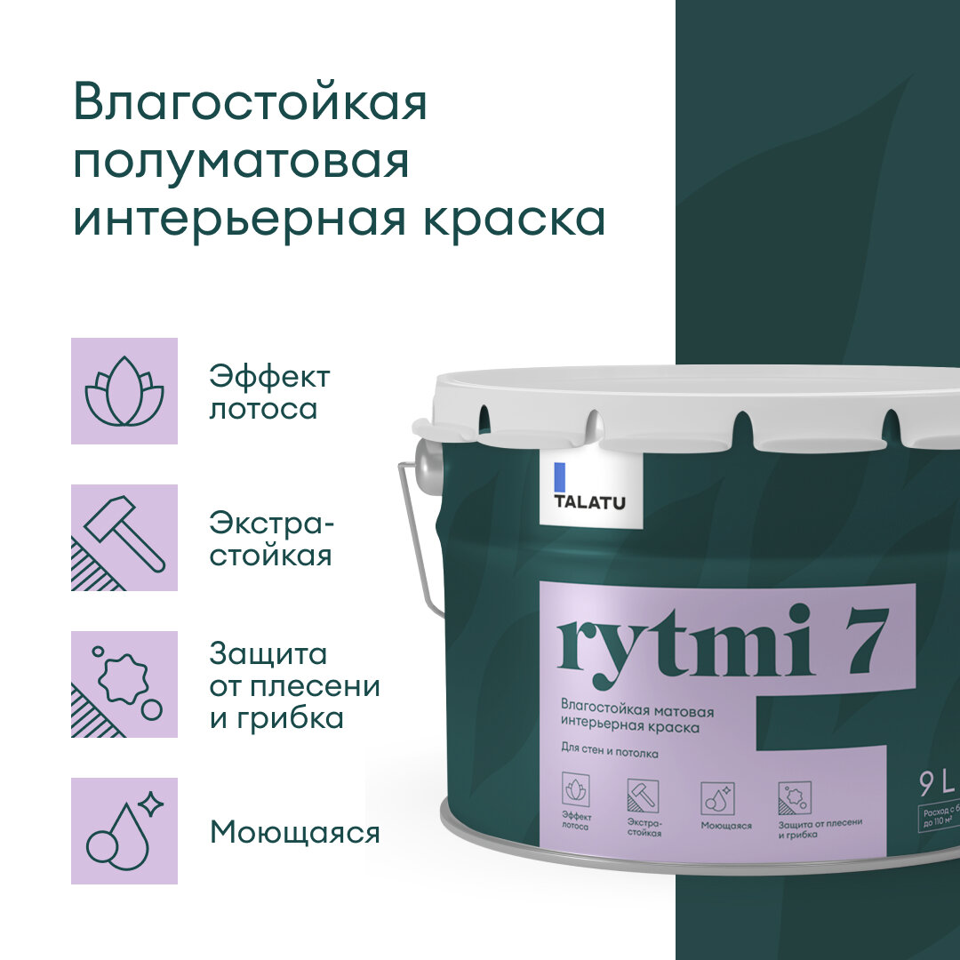 Краска для стен и потолков влагостойкая матовая TALATU RYTMI 7 база A 9,0 л