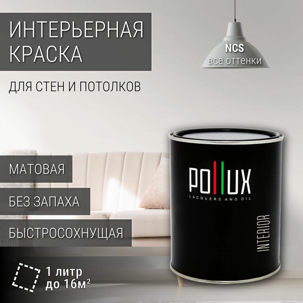 Краска моющаяся интерьерная для стен и потолков, Pollux INTERIOR без запаха, быстросохнущая, акриловая, матовое покрытие, цвет NCS S 1500-N, 1л.