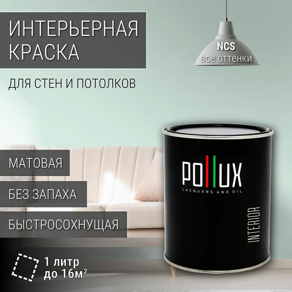 Краска моющаяся интерьерная для стен и потолков, Pollux INTERIOR без запаха, быстросохнущая, акриловая, матовое покрытие, цвет NCS S 1020-B90G, 1л.