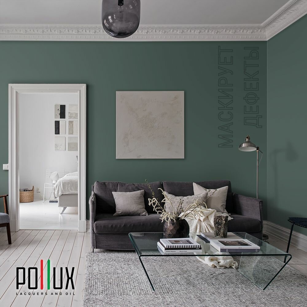 Краска моющаяся интерьерная для стен и потолков, Pollux INTERIOR без запаха, быстросохнущая, акриловая, матовое покрытие, цвет NCS S 6030-B90G, 1л.