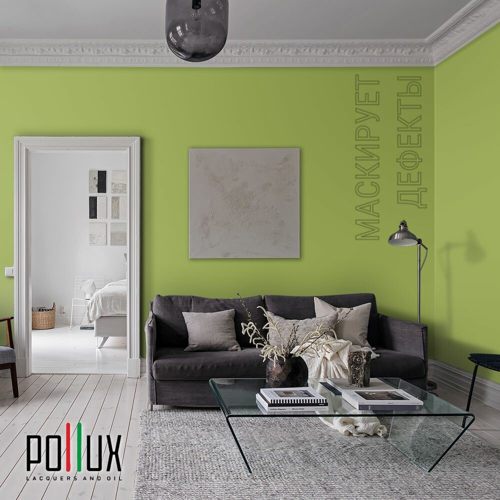 Краска моющаяся интерьерная для стен и потолков, Pollux INTERIOR без запаха, быстросохнущая, акриловая, матовое покрытие, цвет NCS S 6010-G50Y, 1л.