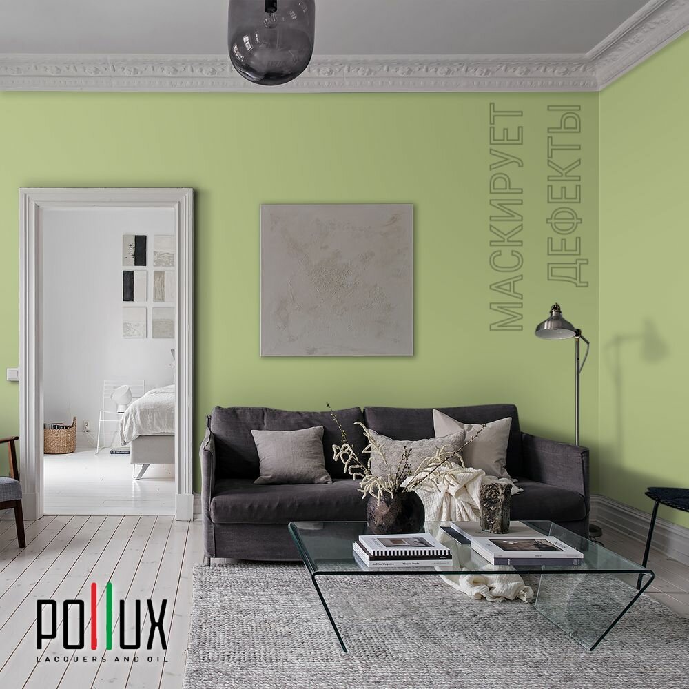 Краска моющаяся интерьерная для стен и потолков, Pollux INTERIOR без запаха, быстросохнущая, акриловая, матовое покрытие, цвет NCS S 6010-G50Y, 1л.