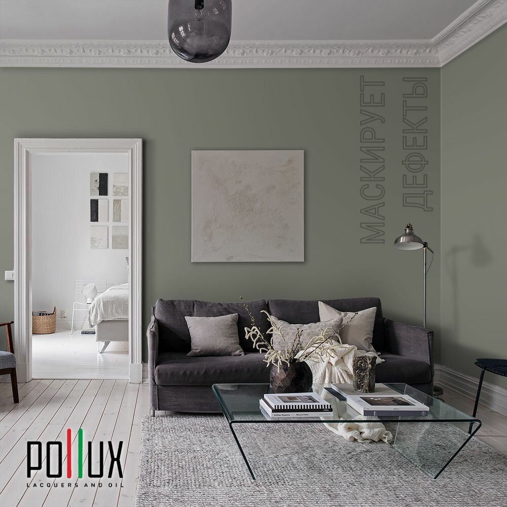 Краска моющаяся интерьерная для стен и потолков, Pollux INTERIOR без запаха, быстросохнущая, акриловая, матовое покрытие, цвет NCS S 7005-G50Y, 1л.