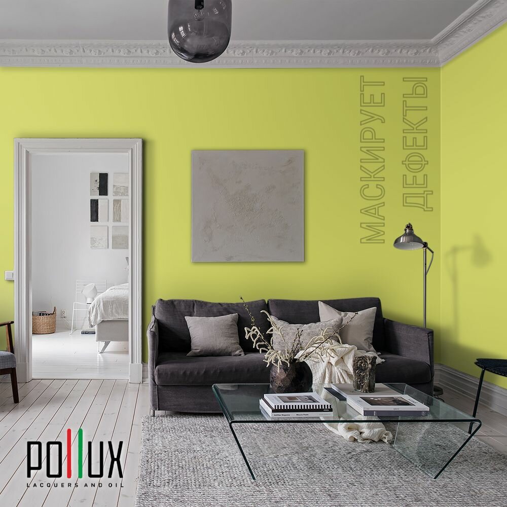 Краска моющаяся интерьерная для стен и потолков, Pollux INTERIOR без запаха, быстросохнущая, акриловая, матовое покрытие, цвет NCS S 1030-G70Y, 1л.