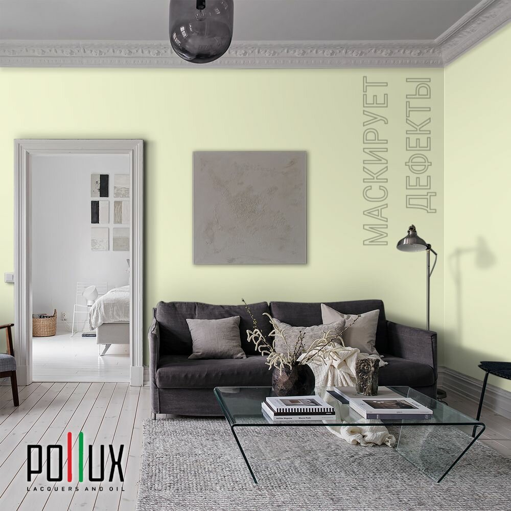 Краска моющаяся интерьерная для стен и потолков, Pollux INTERIOR без запаха, быстросохнущая, акриловая, матовое покрытие, цвет NCS S 0505-G70Y, 1л.