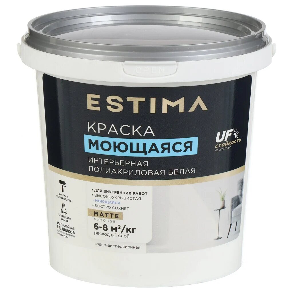 Купить Краска воднодисперсионная, Estima, полиакриловая, интерьерная, моющаяся, матовая, белая, 1.5 кг