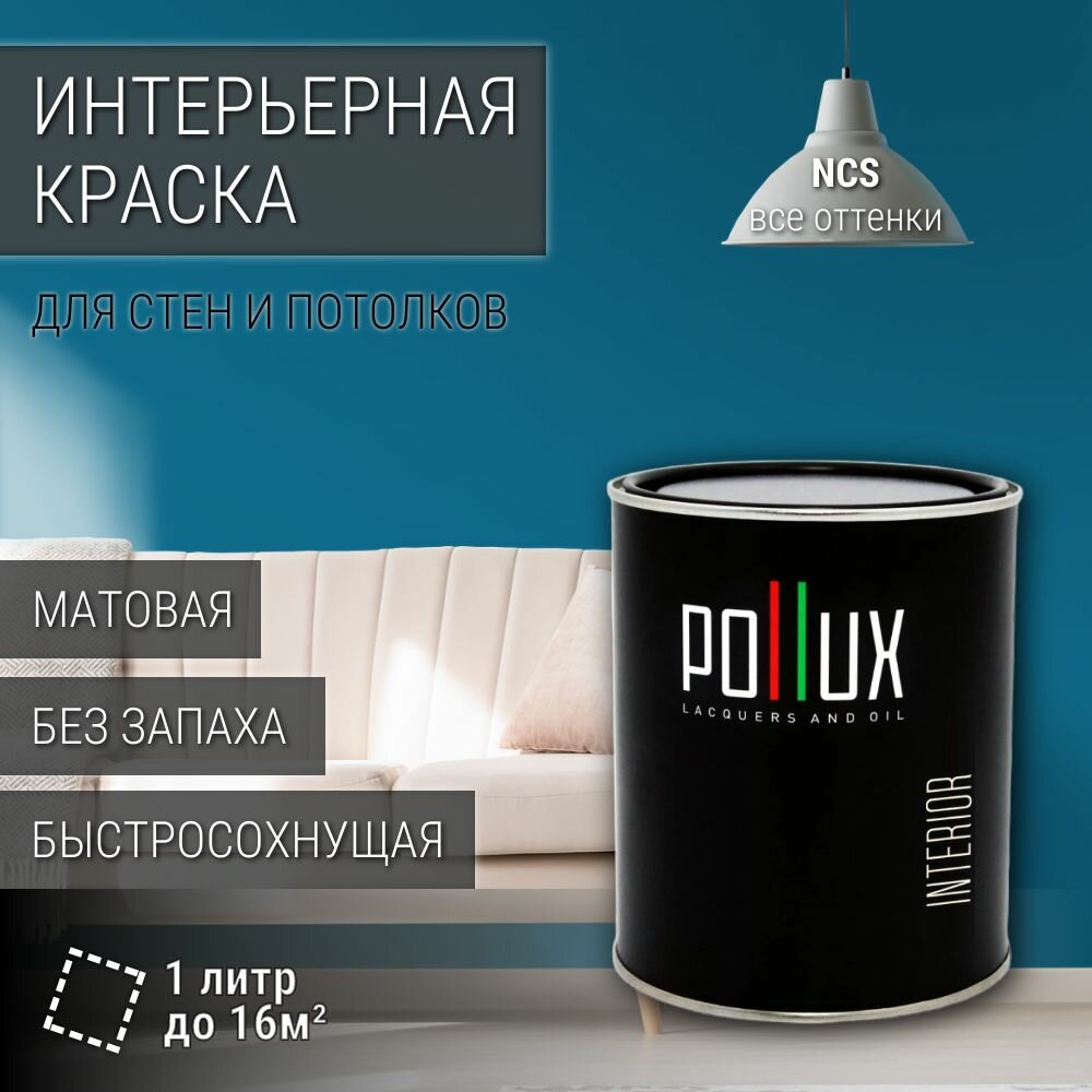 Краска моющаяся интерьерная для стен и потолков, Pollux INTERIOR без запаха, быстросохнущая, акриловая, матовое покрытие, цвет NCS S 2040-B, 1л.