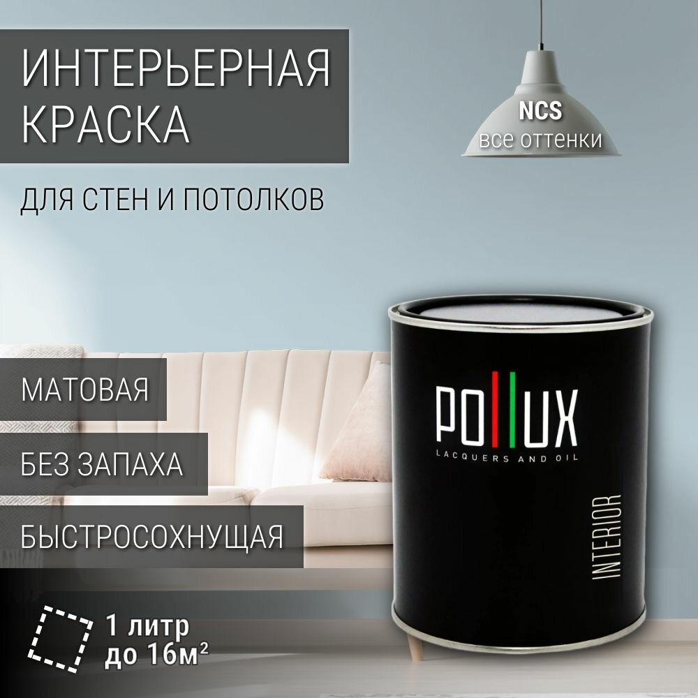 Краска моющаяся интерьерная для стен и потолков, Pollux INTERIOR без запаха, быстросохнущая, акриловая, матовое покрытие, цвет NCS S 1020-B, 1л.