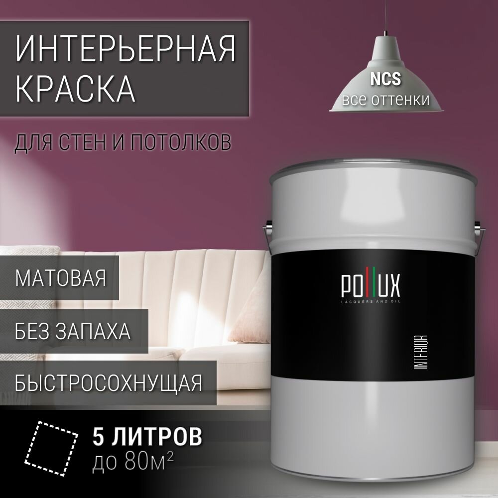 Краска моющаяся интерьерная для стен и потолков, Pollux INTERIOR без запаха, быстросохнущая, акриловая, матовое покрытие, цвет NCS S 2005-R30B, 5л.