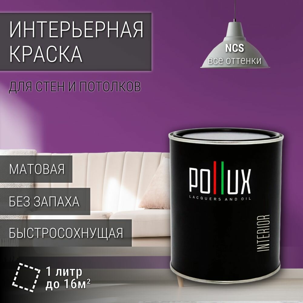 Краска моющаяся интерьерная для стен и потолков, Pollux INTERIOR без запаха, быстросохнущая, акриловая, матовое покрытие, цвет NCS S 3005-R50B, 1л.