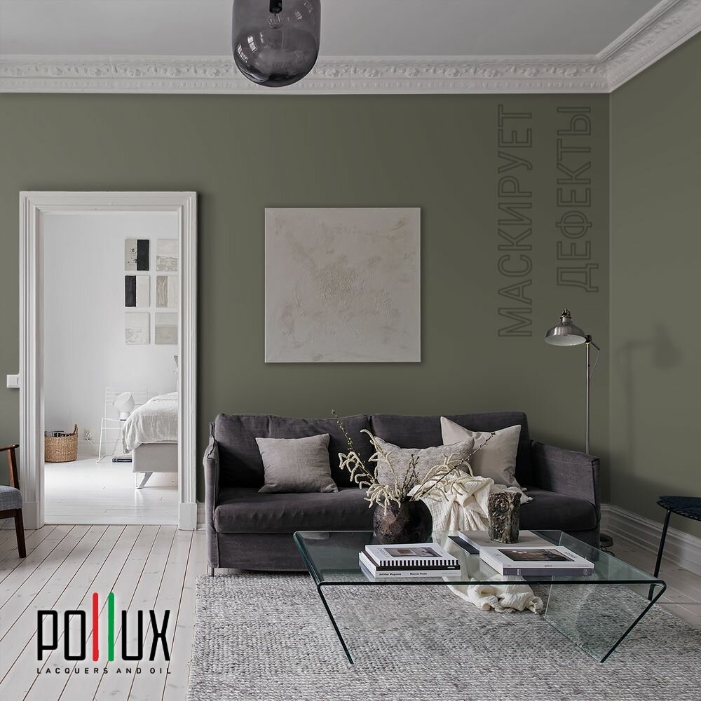 Краска моющаяся интерьерная для стен и потолков, Pollux INTERIOR без запаха, быстросохнущая, акриловая, матовое покрытие, цвет NCS S 3030-G80Y, 1л.