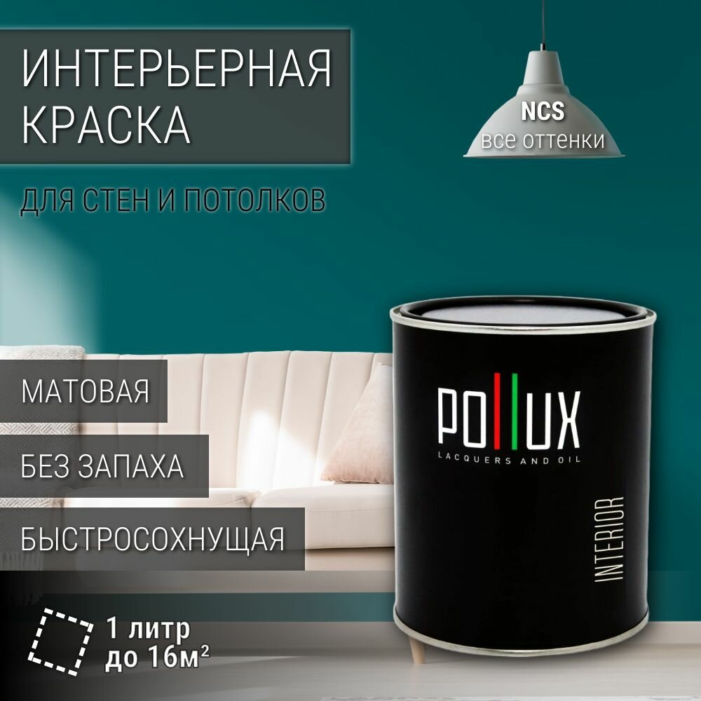 Краска моющаяся интерьерная для стен и потолков, Pollux INTERIOR без запаха, быстросохнущая, акриловая, матовое покрытие, цвет NCS S 1020-B40G, 1л.