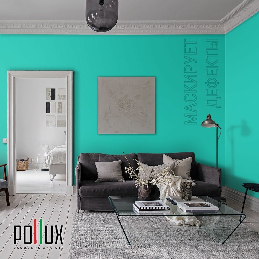 Краска моющаяся интерьерная для стен и потолков, Pollux INTERIOR без запаха, быстросохнущая, акриловая, матовое покрытие, цвет NCS S 1050-B70G, 1л.