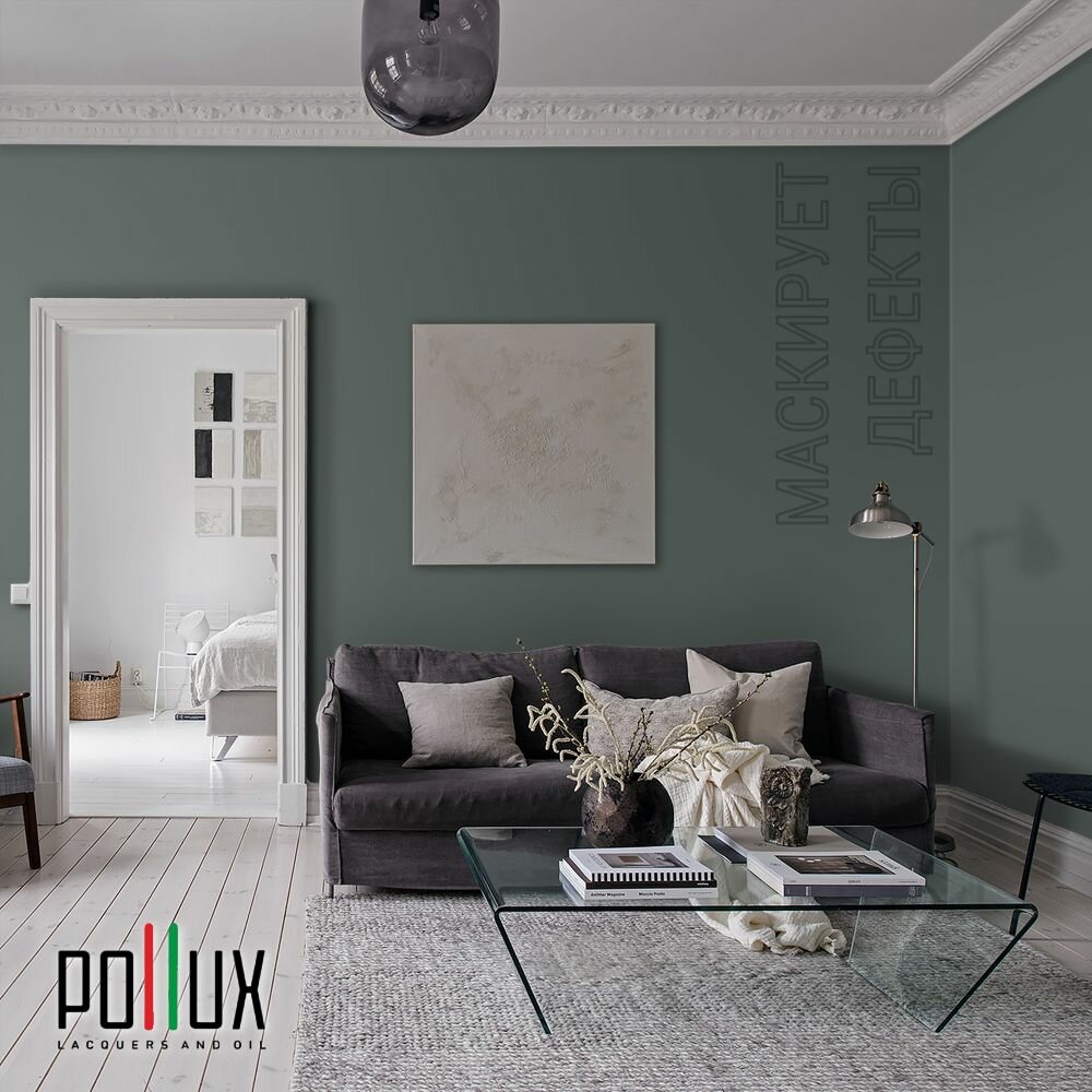 Краска моющаяся интерьерная для стен и потолков, Pollux INTERIOR без запаха, быстросохнущая, акриловая, матовое покрытие, цвет NCS S 4050-B80G, 1л.