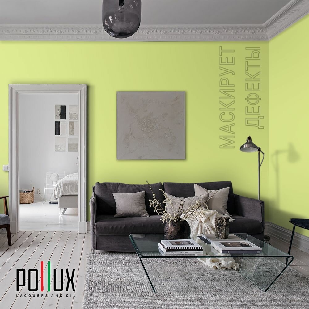 Краска моющаяся интерьерная для стен и потолков, Pollux INTERIOR без запаха, быстросохнущая, акриловая, матовое покрытие, цвет NCS S 1030-G60Y, 1л.