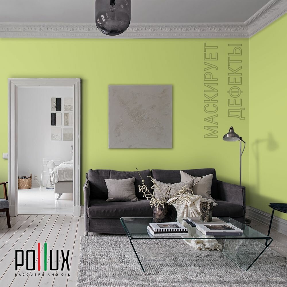 Краска моющаяся интерьерная для стен и потолков, Pollux INTERIOR без запаха, быстросохнущая, акриловая, матовое покрытие, цвет NCS S 1030-G60Y, 1л.