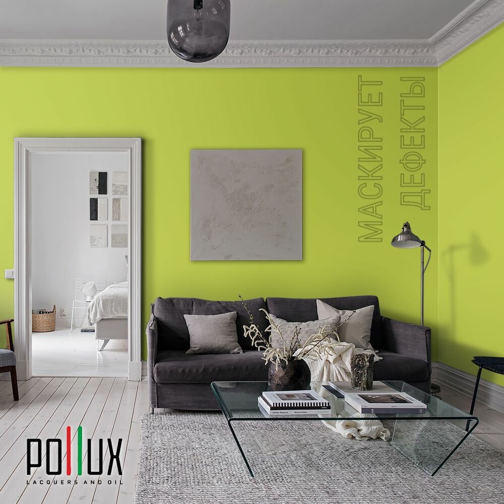Краска моющаяся интерьерная для стен и потолков, Pollux INTERIOR без запаха, быстросохнущая, акриловая, матовое покрытие, цвет NCS S 1030-G60Y, 1л.