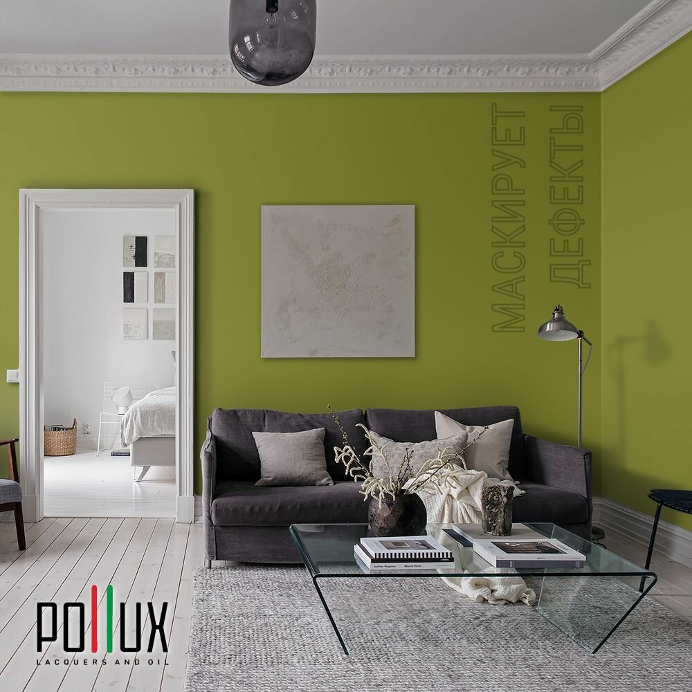 Краска моющаяся интерьерная для стен и потолков, Pollux INTERIOR без запаха, быстросохнущая, акриловая, матовое покрытие, цвет NCS S 1040-G60Y, 1л.