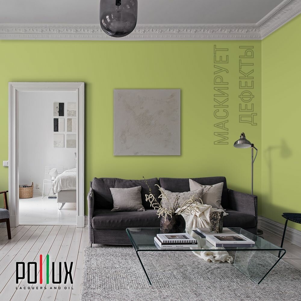 Краска моющаяся интерьерная для стен и потолков, Pollux INTERIOR без запаха, быстросохнущая, акриловая, матовое покрытие, цвет NCS S 1030-G60Y, 1л.