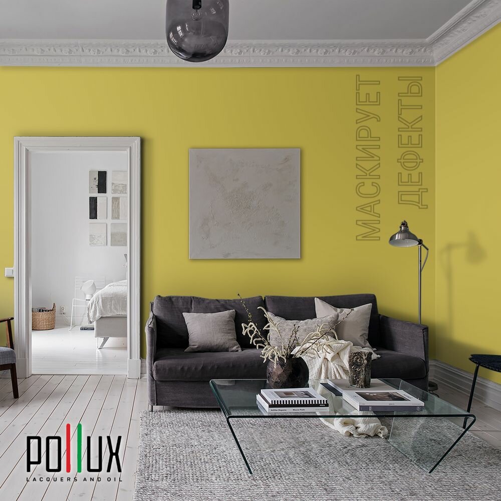Краска моющаяся интерьерная для стен и потолков, Pollux INTERIOR без запаха, быстросохнущая, акриловая, матовое покрытие, цвет NCS S 1010-G90Y, 1л.