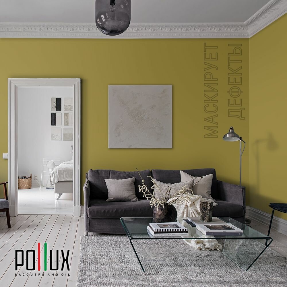 Краска моющаяся интерьерная для стен и потолков, Pollux INTERIOR без запаха, быстросохнущая, акриловая, матовое покрытие, цвет NCS S 1010-G90Y, 1л.