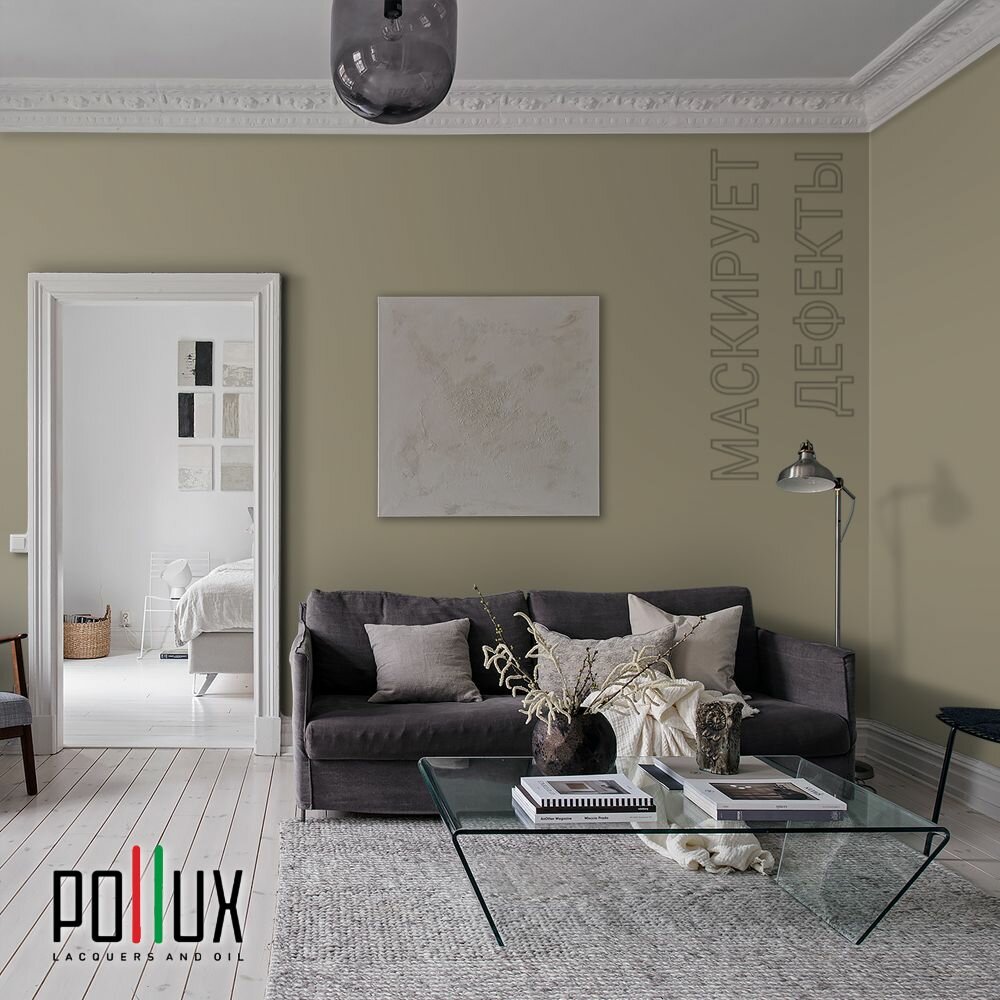 Краска моющаяся интерьерная для стен и потолков, Pollux INTERIOR без запаха, быстросохнущая, акриловая, матовое покрытие, цвет NCS S 8010-G90Y, 1л.