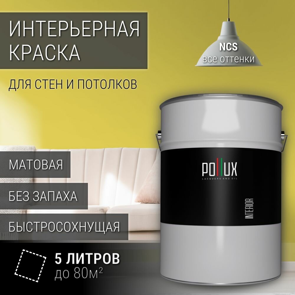 Краска моющаяся интерьерная для стен и потолков, Pollux INTERIOR без запаха, быстросохнущая, акриловая, матовое покрытие, цвет NCS S 1010-G90Y, 5л.