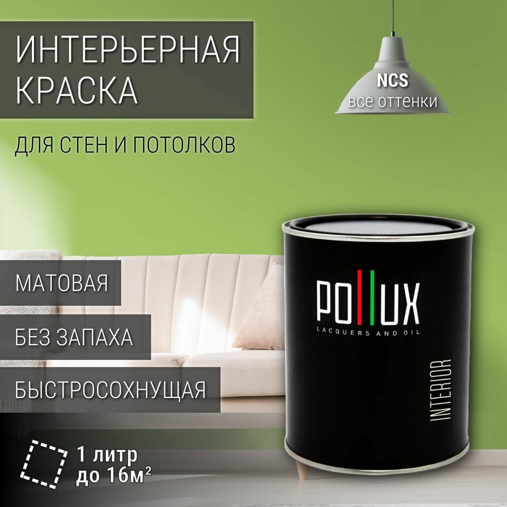 Краска моющаяся интерьерная для стен и потолков, Pollux INTERIOR без запаха, быстросохнущая, акриловая, матовое покрытие, цвет NCS S 1040-G40Y, 1л.