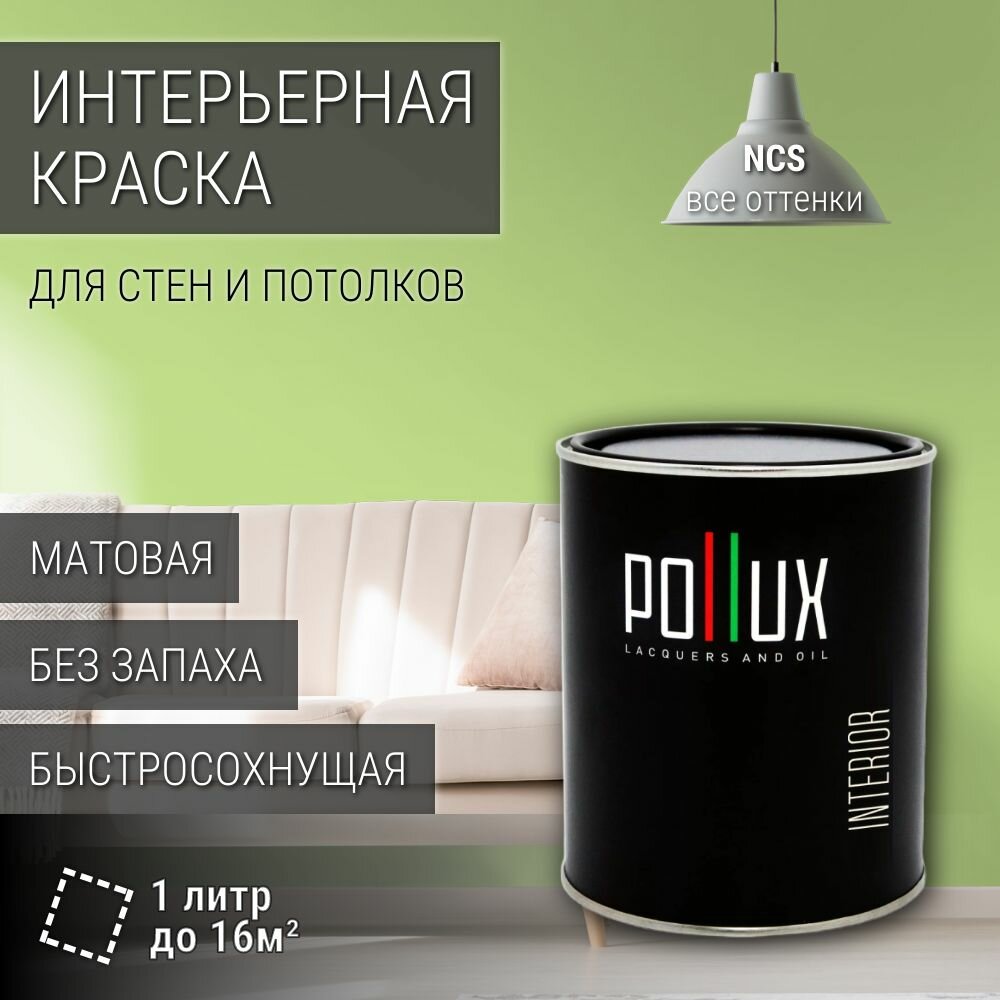 Краска моющаяся интерьерная для стен и потолков, Pollux INTERIOR без запаха, быстросохнущая, акриловая, матовое покрытие, цвет NCS S 0570-G40Y, 1л.