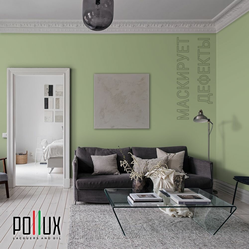 Краска моющаяся интерьерная для стен и потолков, Pollux INTERIOR без запаха, быстросохнущая, акриловая, матовое покрытие, цвет NCS S 2005-G40Y, 1л.