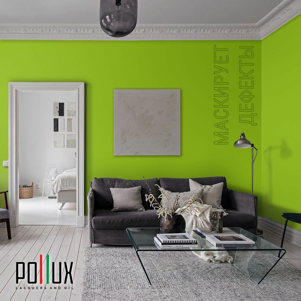 Краска моющаяся интерьерная для стен и потолков, Pollux INTERIOR без запаха, быстросохнущая, акриловая, матовое покрытие, цвет NCS S 3030-G40Y, 1л.
