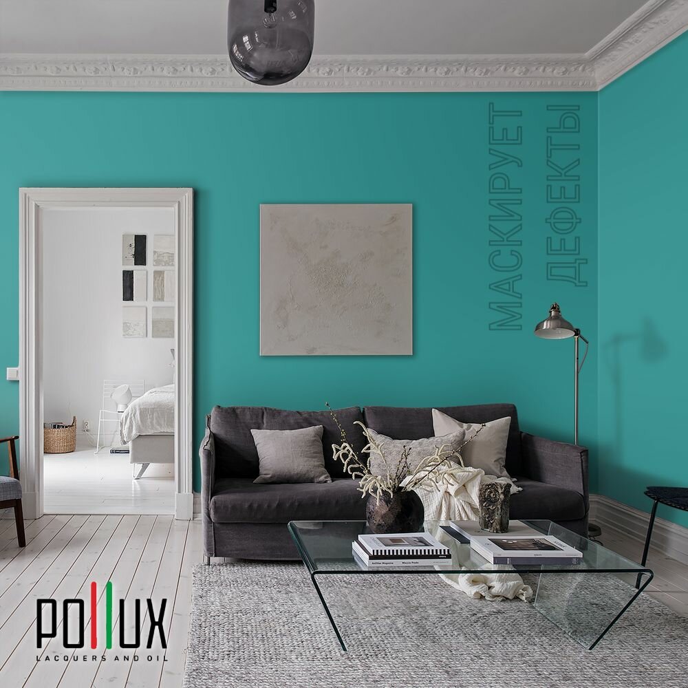 Краска моющаяся интерьерная для стен и потолков, Pollux INTERIOR без запаха, быстросохнущая, акриловая, матовое покрытие, цвет NCS S 4050-B50G, 1л.