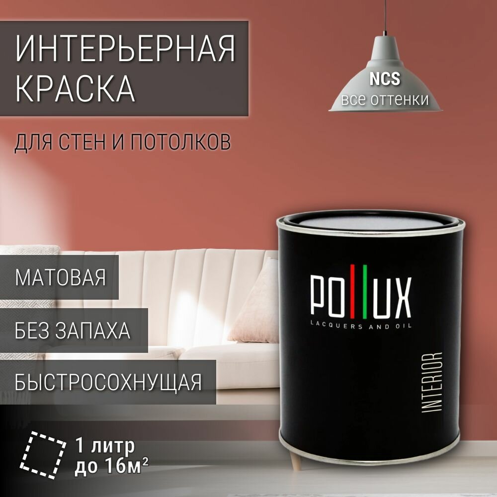 Краска моющаяся интерьерная для стен и потолков, Pollux INTERIOR без запаха, быстросохнущая, акриловая, матовое покрытие, цвет NCS S 3010-Y80R, 1л.