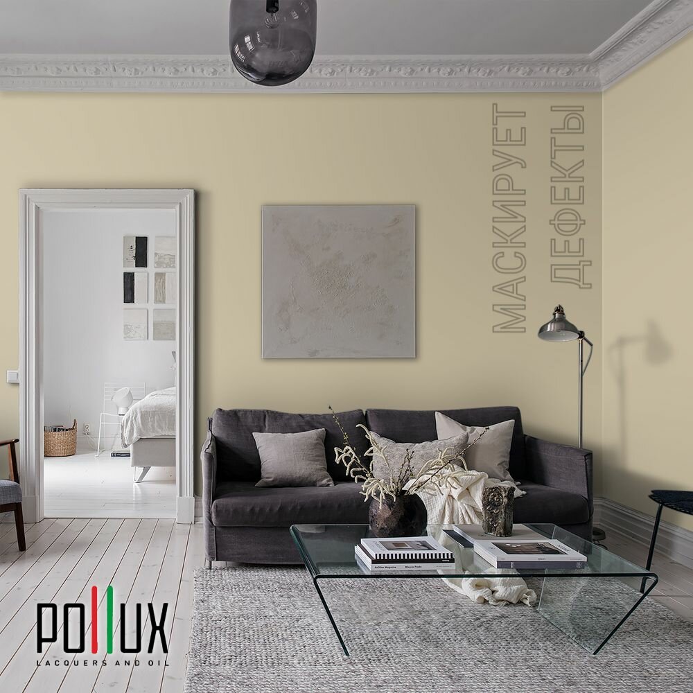 Краска моющаяся интерьерная для стен и потолков, Pollux INTERIOR без запаха, быстросохнущая, акриловая, матовое покрытие, цвет NCS S 0510-Y10R, 1л.