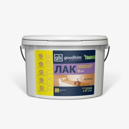 Лак акриловый пропитывающий для бань и саун с антисептиком бесцветный GOODHIM TEXTURE 500, 2 кг. 1424