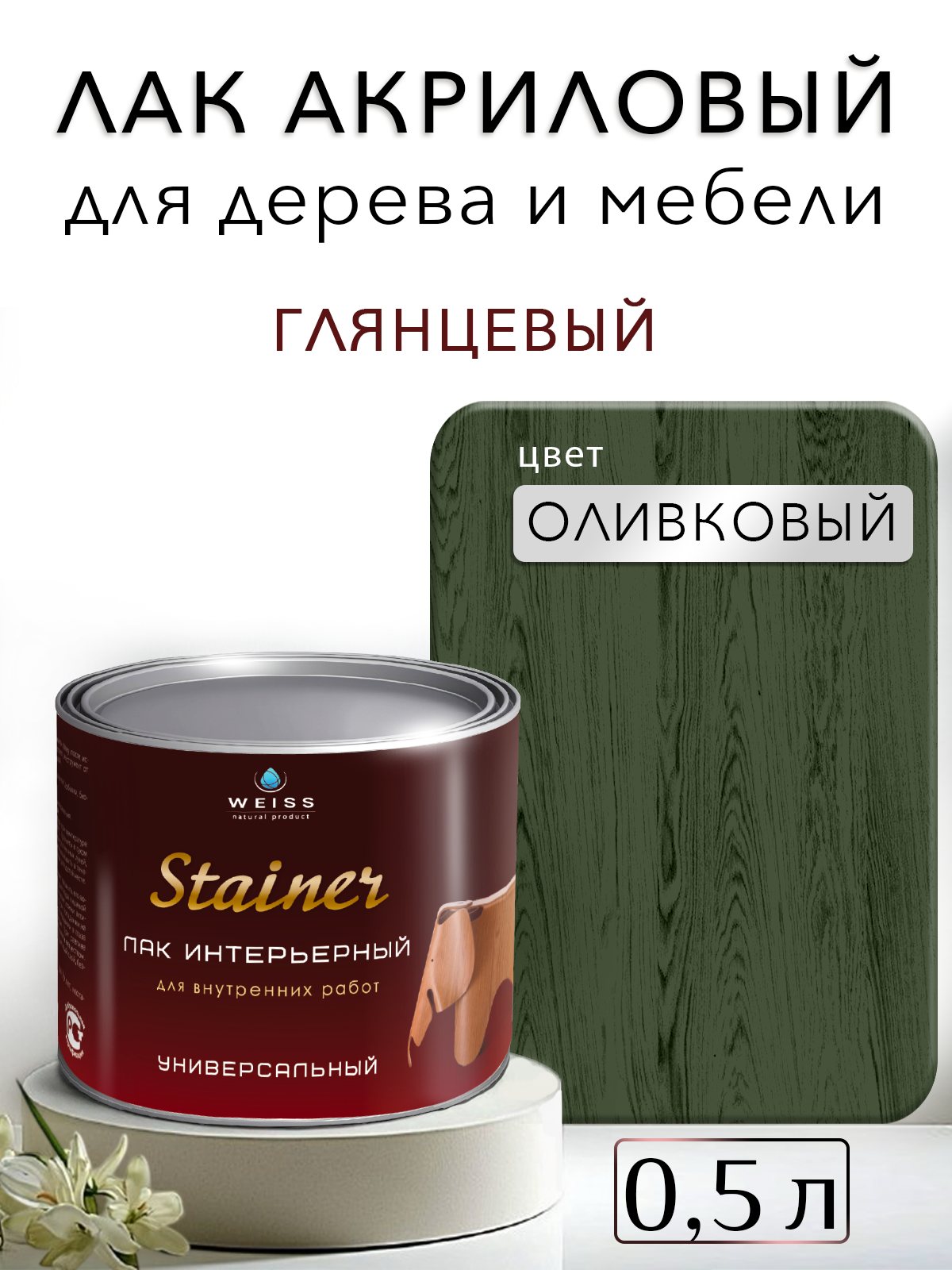 Купить Лак для дерева акриловый оливковый, глянцевый, Weiss natural product, без запаха, самовыравнивающийся, 0.5л