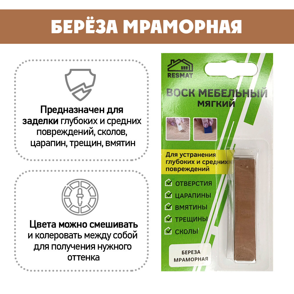 СохранитьВоск мебельный Resmat для реставрации мебели и ламината 1 шт. в упаковке, "Береза Мраморная" интересное: