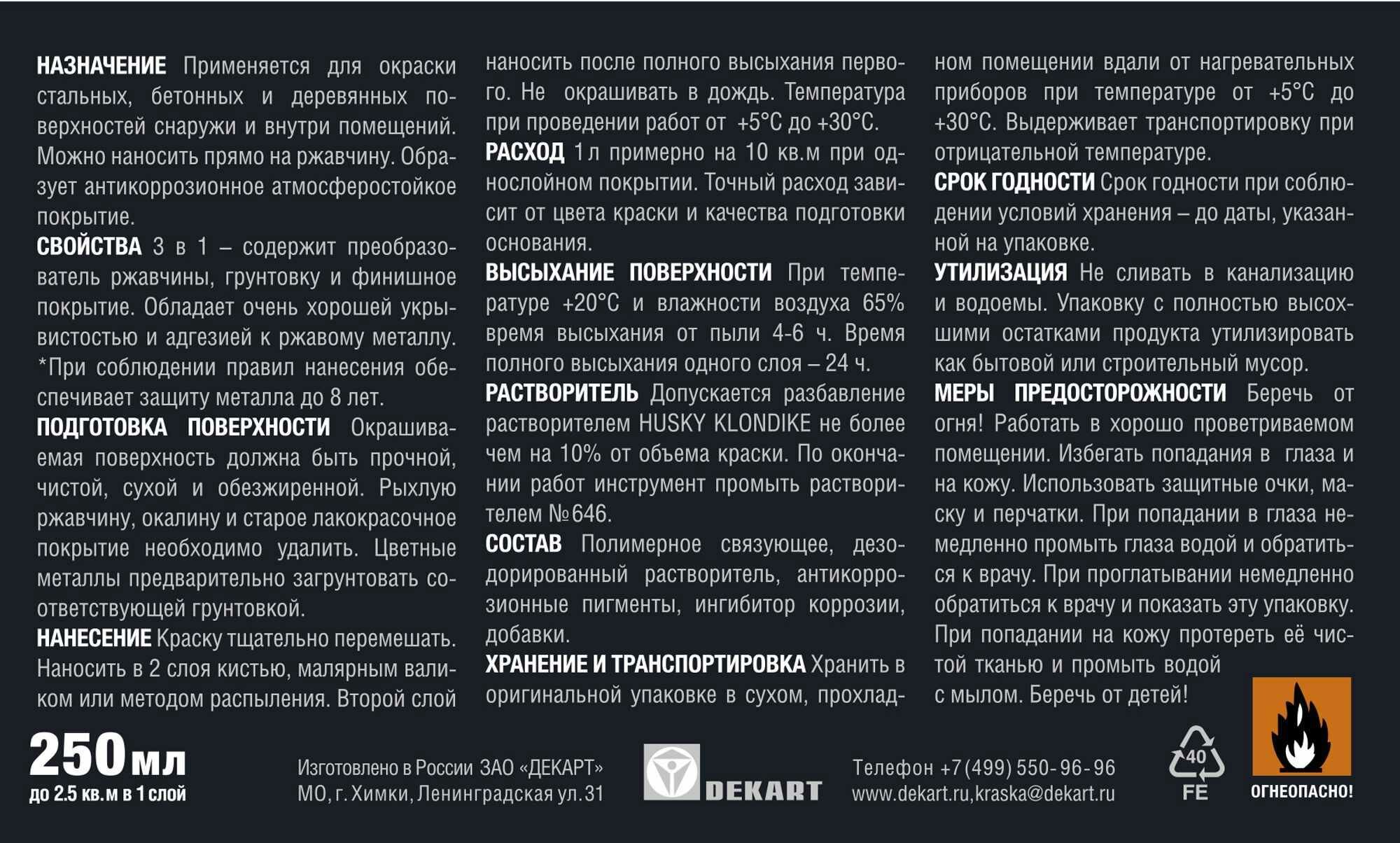 HUSKY KLONDIKE Грунт-эмаль 3 в 1, краска по металлу, по ржавчине, декоративная матовая черная RAL 9005 (250мл)