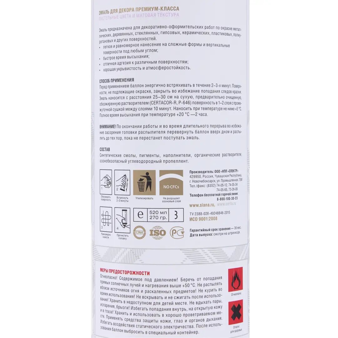Ниже Вы можете прочитать отзывы на Эмаль аэрозольная Siana Provence лиловый рассвет 520Мл, ознакомится с подробными характеристиками, посмотреть интересные обзоры и фотографии на Эмаль аэрозольная Siana Provence лиловый рассвет 520Мл.