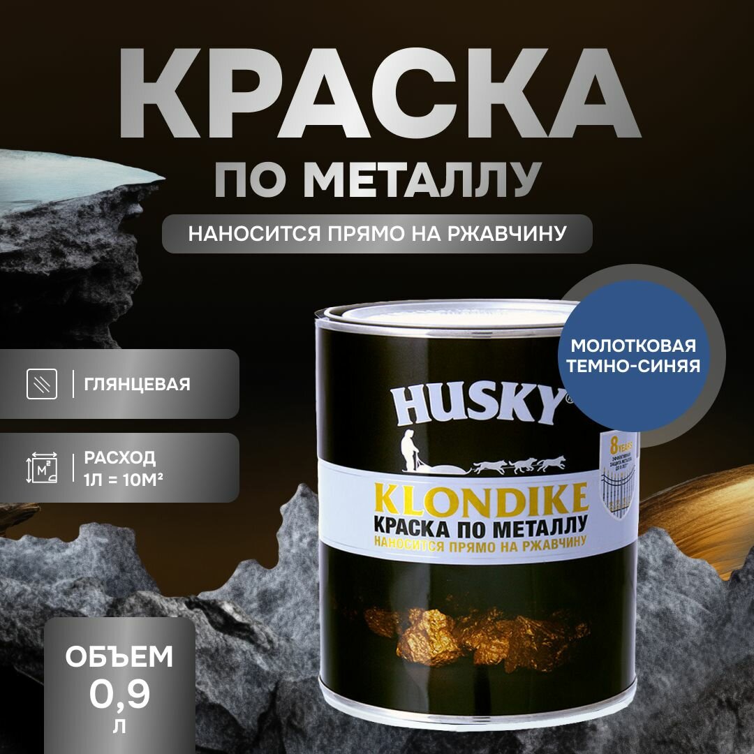Купить HUSKY KLONDIKE Грунт-эмаль 3 в 1, краска по металлу молотковая, по ржавчине, декоративная, темно-синяя (0,9л)