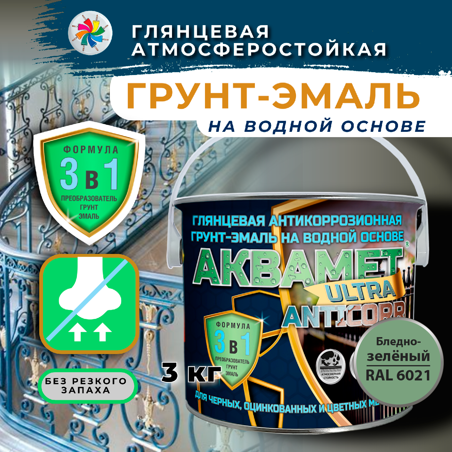 Купить Краска по металлу, грунт эмаль по ржавчине, Аквамет ULTRA Anticorr, RAL 6021, 3 кг.