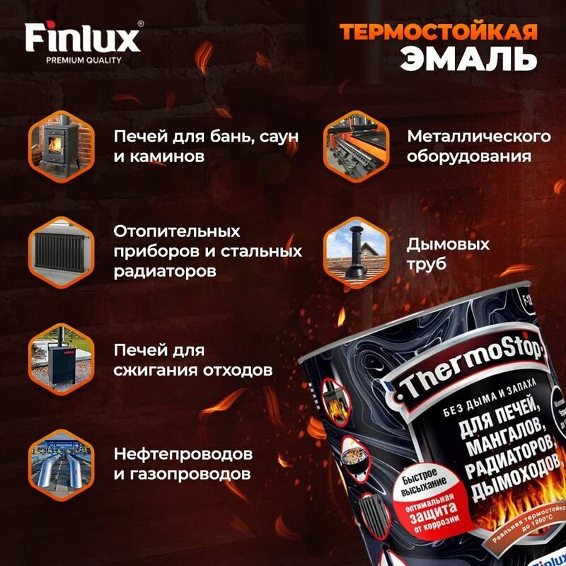 Краска, Грунт-Эмаль Finlux F-1200 до +400C Антикоррозионная, для печей, мангалов, дымоходов, радиаторов, суппортов, глушителей Гладкая, Быстросохнущая, Кремнийорганическая, Матовое покрытие, Черный, 0,25 кг, 400 С